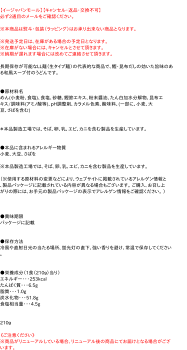 ) 〜原材料名〜 めん(小麦粉、食塩)、食塩、砂糖、鰹節粉、醤油、昆布粉、調味料(アミノ酸等)、酸味料、カラメル色素、pH調整剤、(原材料の一部に、小麦、大豆、さば、鶏肉を含む) *本品製造工場では、そば、卵、乳、エビ、カニを含む製品を生産しています。